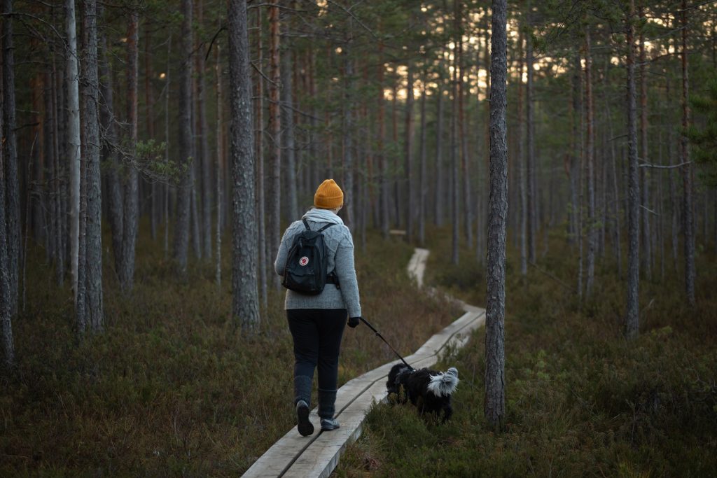 Valkmusan Läntisen keitaan rengasreitti on suosittu myös koirien kanssa retkeilevien keskuudessa. Laajat avosuot, pitkospuiden rauha ja lintutornin näkymät tekevät reitistä elämyksen jokaisena vuodenaikana – mutta erityisesti syksyn sumuisina aamuina.