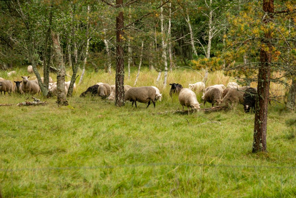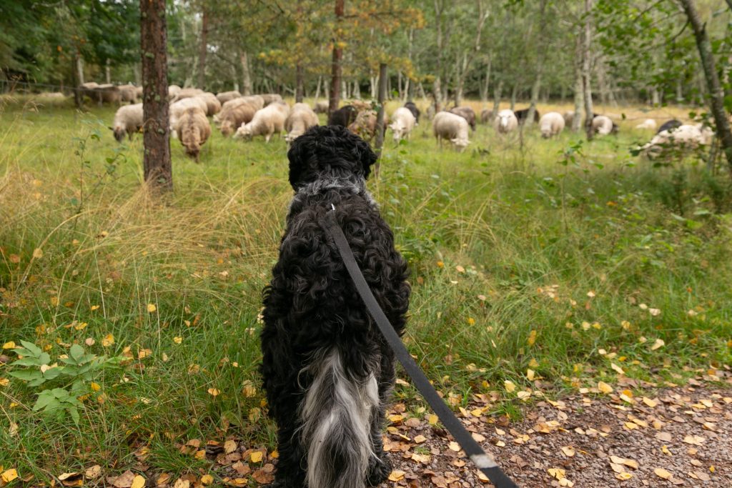 Ehdimme kulkea tovin rantaluonnon ja laidunmaiden välistä, kunnes puiden siimeksestä alkoi näkyä ensin muutama lammas, jotka hetken kuluttua monistuivat potenssiin ja lopulta seisahduimme katselemaan oikein kunnon lammaslaumaa, johon kuului varmasti yli 20 lammasta. Koira jäi uteliaana seisomaan paikalleen ja katsomaan lampaiden touhuja. Lampaat olivat selvästi tottuneita heitä tuijotteleviin kaksi- ja nelijalkaisiin ja muutama niistä tulikin aivan aidan tuntumaan katselemaan meitä lähemmin. Hetken siinä tuijottelimme toisiamme, kunnes sekä me, että lampaat jatkoimme matkaa eri suuntiin.