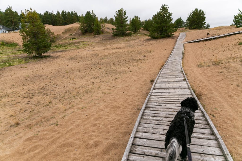Hotelli Lokkilinnan vierestä rannasta kulkee lankkupolku, jota pitkin kuljimme ihastellen samalla hiekkasärkkien maisemaa. Heinien ja kivikkokasvien lisäksi rannan penkereellä kasvaa myös mäntyjä, jotka ovat varmasti joutuneet kasvattamaan syvän juuriston selvitäkseen.