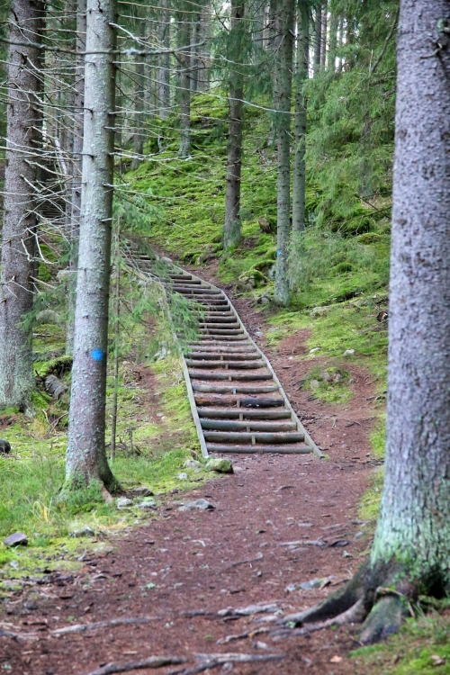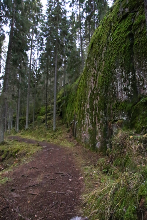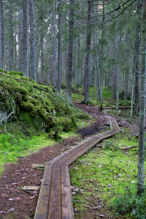 Reitti mutkittelee loppumatkan rinteen alareunaa pitkin välillä polkuna, välillä pitkospuina. Luontopolku on kokonaisuudessaan mielestäni helppokulkuinen. Nousuja on yksi alkuvaiheessa ja laskuja samoin reitin puolessa välissä.