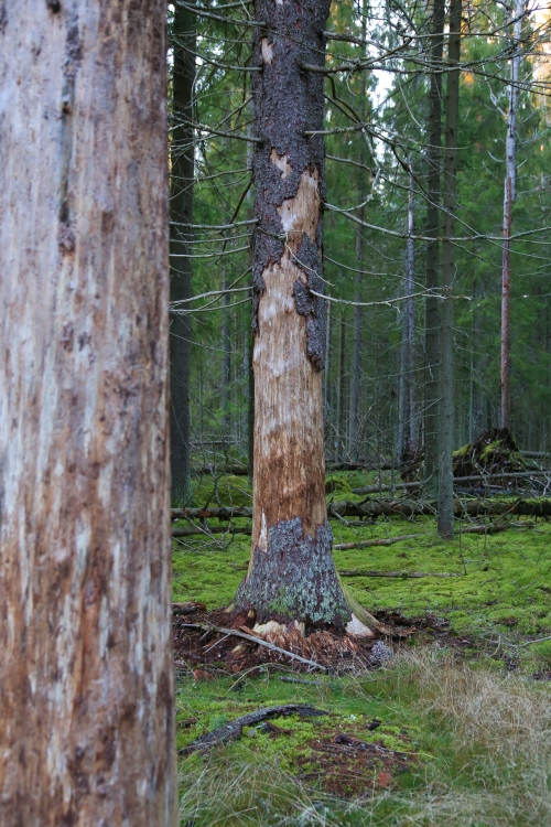 Portaiden yläpäästä matka jatkuu Niivermäen päällä. Vastaan tulee lähes pystyyn kuolleita sekä kaatuneita puita, joiden kaarna on kuoriutunut. Kirjanpainaja on käynyt tekemässä täällä tuhojaan. Niin hienon kuvion kuin se puun runkoon ja kaarnaan tekeekin, ei se varmasti ole koskaan mikään kovin kutsuttu vieras metsissä.
