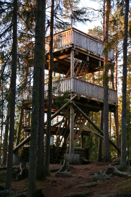 Kirjanpainajan tuhojen jälkeen reitti kaartaa oikealle sammalten peittämään korpimaisemaan. Pitkospuiden luona on merkki luontotornista, joka nousee polun yläpäässä kirjaimellisesti kuin puskista.