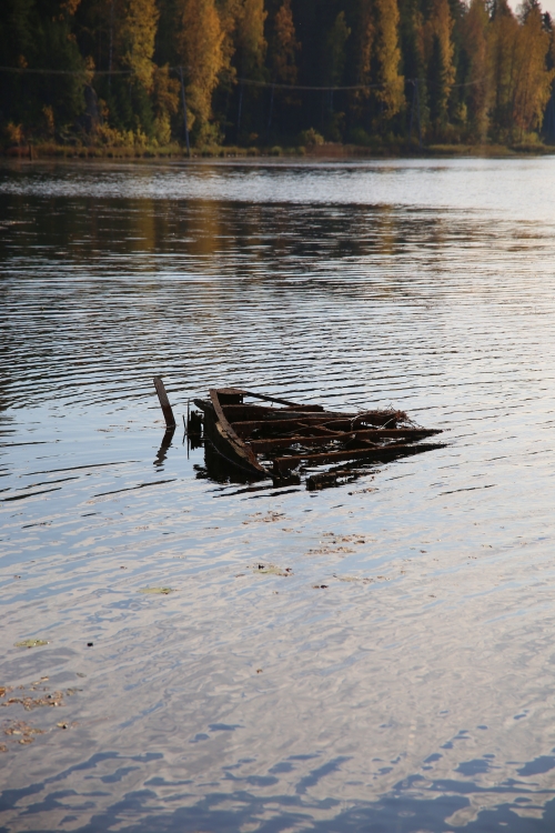 Lapatonniemestä polku jatkuu kylätietä ja rantaa pitkin. Rannan tuntumassa on uponnut vene. Mikä lie ollut sen tarina. Rannasta kylätie vie hiekkatielle ja lopulta Vanhalle Mikkelintielle, jota kuljetaan hetken aikaa.