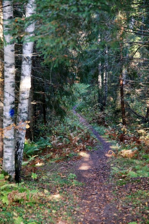 Reitti lähtee viemään kylätietä pitkin ja se on merkitty sinisin tolpin. Aluksi kävelemme pitkin kylätietä, kunnes tie poikkeaa vielä pienemmälle tielle. Opastauluja on matkan varrella säännöllisin välimatkoin ja pysähdymme lukemaan ne kaikki. Vanhaa palotallia seuraa sahan konttori ja hetken päästä sahan vanhat asuinrakennukset, joista osasta on jäljellä enää kivijalat.